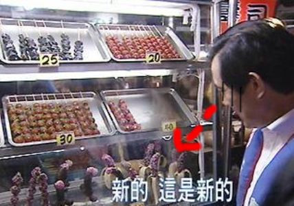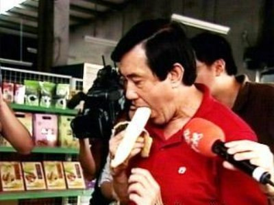 馬英九到夜市拜票,被當地里長帶去看作成陰莖狀的「巧克力香蕉」